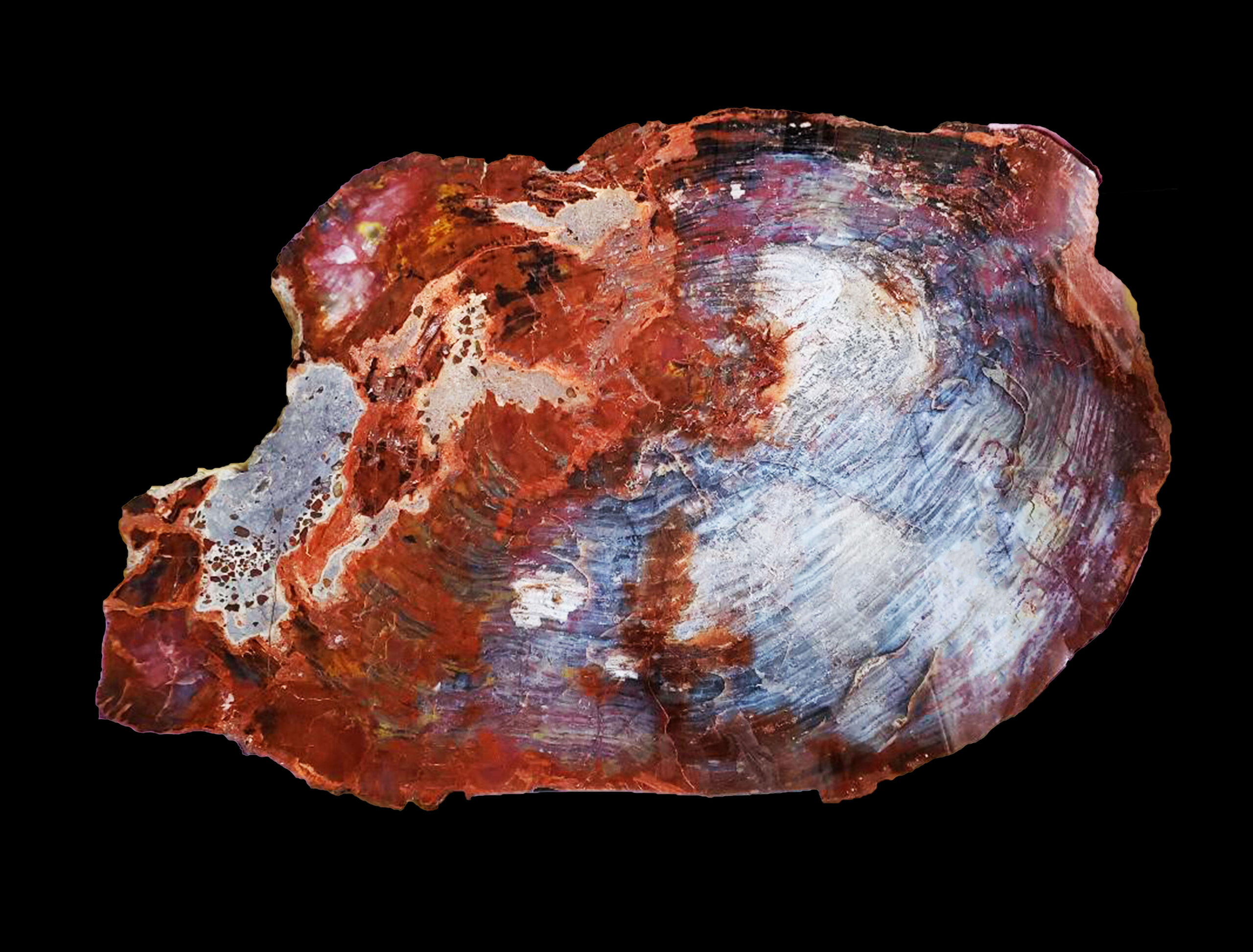 Expansive and luminous, this 40-by-57-inch petrified wood round from the Lewis Ranch captures the grandeur of geological time rendered in stone. Once part of an ancient Araucarioxylon pine that thrived over 220 million years ago, this exceptional specimen now stands as a monumental yet refined expression of nature’s craftsmanship.